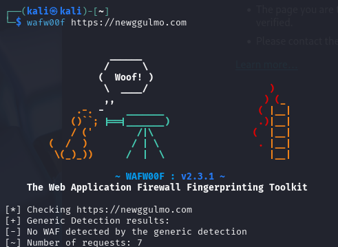 WAF ํ์ง ๋๊ตฌ์ธ wafw00f๋ฅผ ํ์ฉํ์ฌ ์น๋ฐฉํ๋ฒฝ ์กด์ฌ ์ฌ๋ถ๋ฅผ ํ์ธํด๋ณธ๊ฒฐ๊ณผ