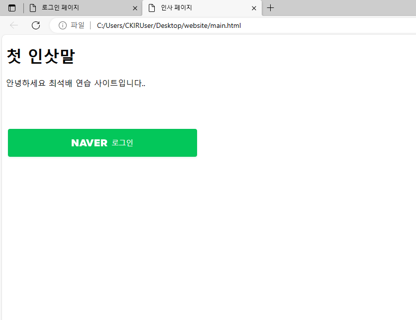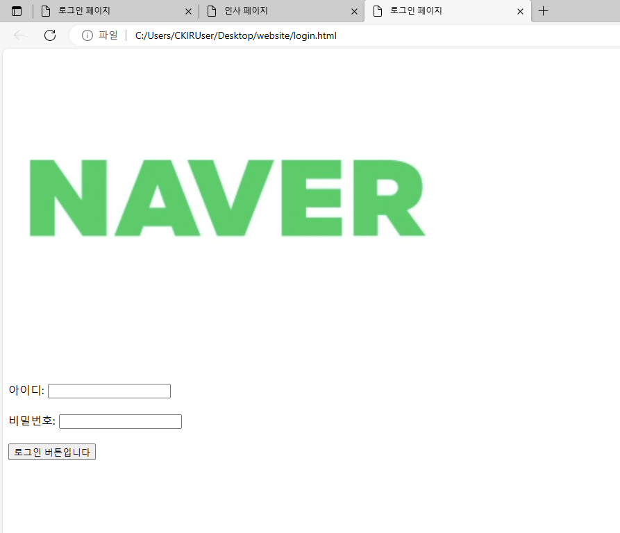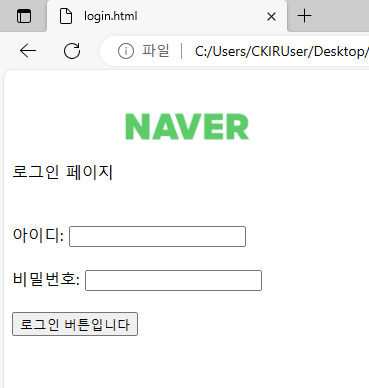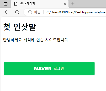 네이버 로고와 버튼이미지를 빌려와 직접 페이지를 만들어보았다.