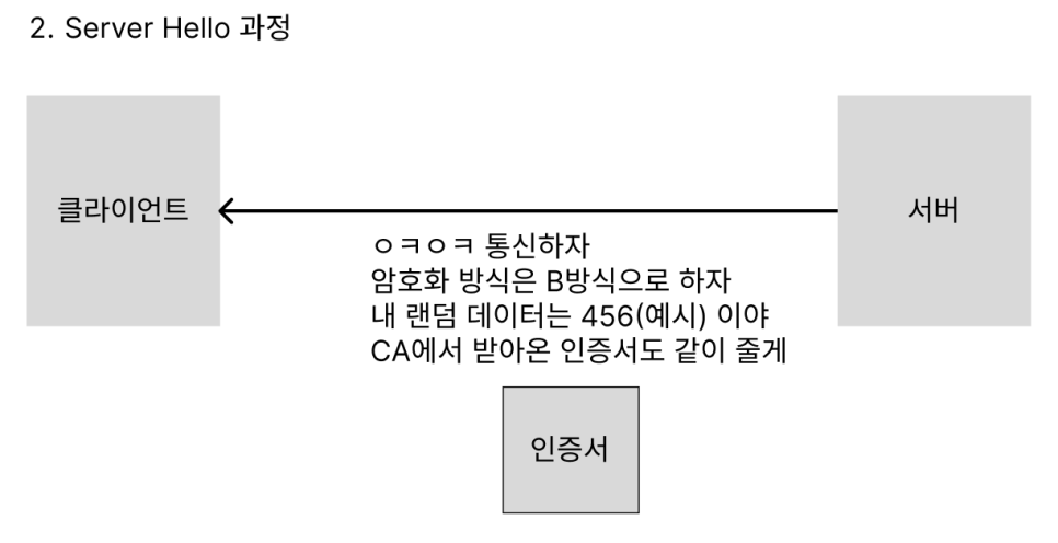 랜덤한 데이터, 클라이언트가 보낸 지원하는 암호화 방식중 하나를 지정, 인증서 를 포함하여 보낸다.