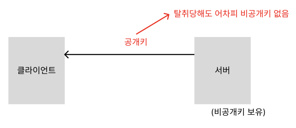 따라서 처음에 서버가 클라이언트에게 키를 건네줄때 사용되는 공개키는 탈취당해도 괜찮다는 뜻이다.