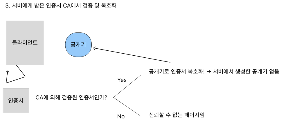 (브라우저에서는 CA의 공개키를 내장하고있음. 따라서 CA에서 검증된 인증서들은 브라우저에서 해당 인증서를 복호화 하고 서버에서 생성한 공개키를 얻게됨)